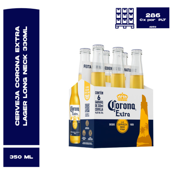 Cerveja Corona Extra Long Neck 350 ml — leve e refrescante, com toque cítrico sutil; ótima escolha para dias quentes ou momentos relaxantes.